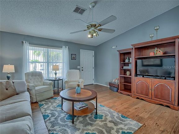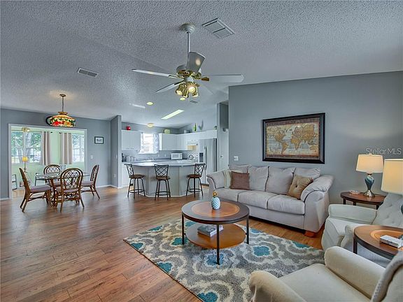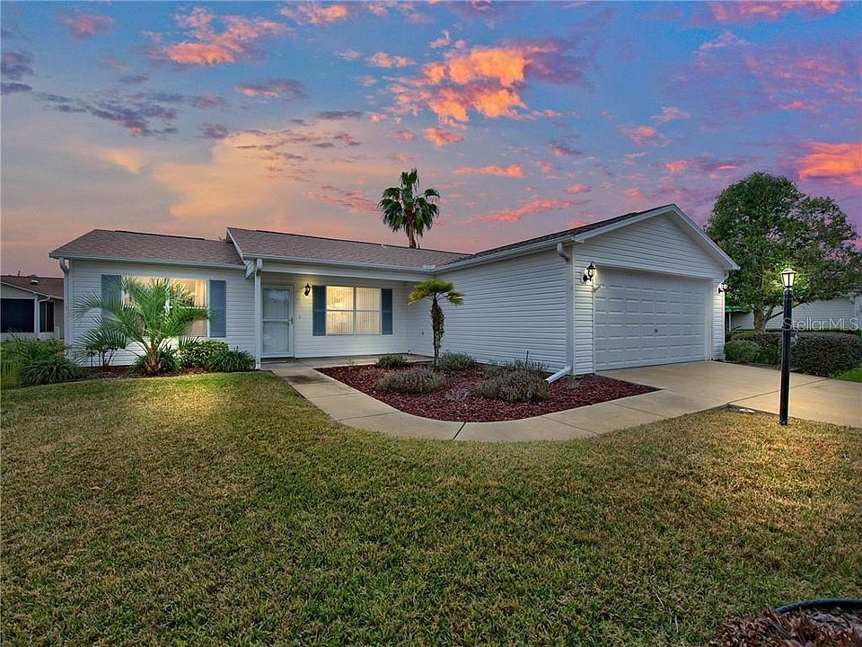 Adorably Updated TURN-KEY "STETSON" Cottage in The Village of SANTO DOMINGO! BOND PAID! Situated on a spacious and slightly elevated homesite with a full 2 car driveway and 2 CAR GARAGE all surrounded by mature landscaping with lava rock filled bed leading to the covered front porch. Through the front storm door you will find the OPEN FLOOR PLAN with VAULTED CEILINGS & WOOD Laminate Flooring throughout this light & bright space. The open kitchen boasts light cabinetry with contrasting countertops, newer STAINLESS STEEL Fridge & Dishwasher & spacious breakfast bar overlooking the living space. The master suite features WOOD Laminate flooring, a walk-in closet & ensuite bath with diagonal ceramic tile, long vanity including sit down space, linen closet & walk-in shower. There is also a frosted window in the bathroom for plenty of natural light! The split bedroom plan boasts a spacious guest room with walk-in closet, adjacent linen closet & guest bath with ceramic tile, long vanity including sit down vanity & shower/tub combo. This home also features a spacious 21' x 9' FLORIDA ROOM! Perfect for an office, den, card room, etc. Adjacent, through sliding glass doors, is a concrete patio perfect for grilling or enjoying the Florida sunshine. This home has been updated throughout the years with NEW ROOF 10/2017, NEW A/C 11/2017, NEW GARAGE DOOR 2019 & NEW HOT WATER HEATER 2019! Plus an ELECTRIC GOLF CART IS INCLUDED along with all of the other TURN-KEY items & accessories - just bring your clothes and start living The Villages Lifestyle or add this lovely home to your rental portfolio with minimal effort! 3D TOUR AVAILABLE!