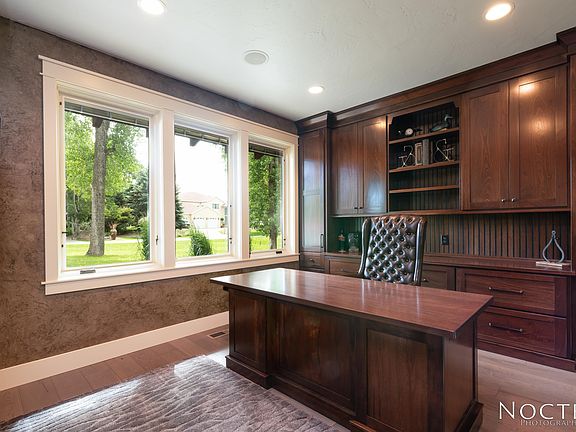 This spectacular custom built home with impressive quality is nestled on an acre lot surrounded by mature trees. As you first enter the main floor you notice the office made for an executive on the left, the formal dining room on the right, and high ceilings over the living room with gas fireplace that leads to the open kitchen. The kitchen is fit for a chef with high end appliances, double oven, quartz counters, tile back splash, cherry cabinets, wine bar, walk in pantry, and a wrap around breakfast nook. The master suite features a large soaker tub, tile shower, and walk in closet with high quality finishes. Directly from the master bedroom is a sun room/workout room. Also on the main floor is the mud room off the garage with laundry and a 1/2 bathroom. The entire main floor has in-floor heat for those cold winter days. The upper level has 4 bedrooms one with a Jack and Jill full bathroom and the other two with on suites. Additionally the upper level offers a finished storage room/kids play room and a large media/TV room with surround sound. The garage has in-floor heat, finished floors, the third stall is double deep, custom cabinets, floor drains, and a finished hobby room off the back. Beautiful exterior landscaping around the home with a backyard covered patio with gas fire pit table, and outdoor grill built in to the stone. Additional features include 2 zone heating/cooling, Sonos Surround Sound (5 zones), whole house water filtration system, Pella windows, underground sprinklers, exterior timber wood framing, and much more. So many features in this stunning home, schedule a private tour today.