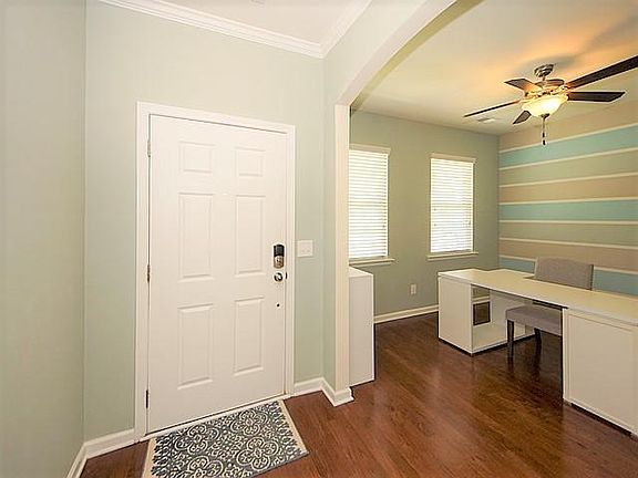 Move-In Ready! Open Floor Plan with tons of natural light. As you enter the home, you will find gleaming hardwood floors with 9-foot ceilings throughout the first floor. The formal living room, dining room and family room are to the left of the home with arched entryways, enhancing the open floor plan. The dining room offers crown molding and wainscoting. The large kitchen boasts 32'' and 42'' staggered height, flat panel Maple Cabinets, with decorative molding, granite countertops, a kitchen island, large pantry and stainless GE Appliances. The first floor includes a powder room, coat closet and additional storage space. On the second floor, you will find a nice open loft space, perfect for a play area, media room or office space. The laundry is located just off the loft area. There aare 3 spacious secondary bedrooms, 2 with walk in closets. The Master Suite is large and includes an impressive walk-in closet, 14ft x 6Fft. The attached bathroom offers comfort height, dual vanity sink, garden tub and separate tiled shower. There is a large screened porch off the back of the home and large backyard with privacy fence. The finished garage has additional overhead storage. The community features sidewalks, green space, and large community pool.