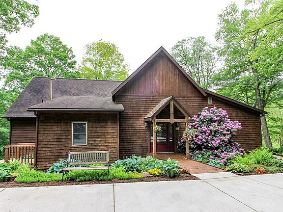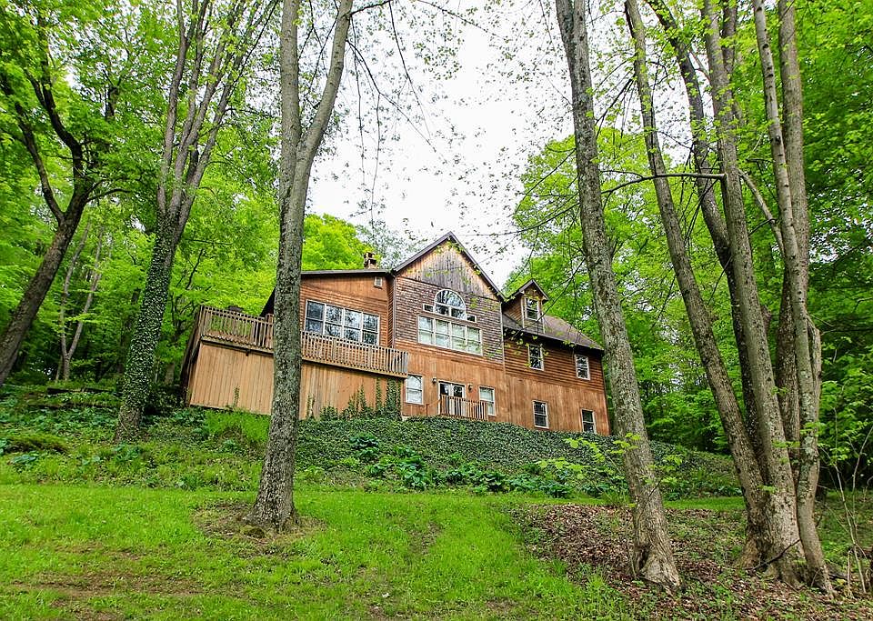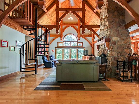 Absolutely stunning. Situated on 9.3 private acres overlooking the stocked pond, this custom-built sunlit beauty was designed to captivate and delivers! 22' ceilings and a soaring stone fireplace from locally collected boulders. Gorgeous views from every window. Open kitchen with stainless appliances. Main floor master suite with jet tub & walk-in shower. 10" solid, poured foundation walls, 2x6 wall construction & solid wood beams throughout. R-24 walls & R-42 roof insulation make for efficient heating/cooling bills. Recently paved driveway & 3rd garage bay addition. Walk-out lower level w family room w fireplace, 2BRs & a full bath. Add'l finished space would make ideal home gym.