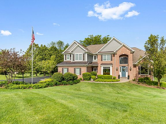 A level of sophistication that is incredibly difficult to even fathom, until it becomes reality. A pristine setting on 1.35 acres is unveiled by a long drive leading the way to a brilliantly designed front elevation with the perfect balance of brick and Hardie board exterior and a gorgeous 8' entry door that opens to a class of its own. A two-story foyer with a winding milled staircase offers a clear view out the back of the home while showcasing an adjacent vaulted living room with panoramic views of the yard. On the opposing side of the foyer is an elegant dining room finished with cherry in-lay floors, wainscoting, extensive crown molding, and access to a butlers pantry. A clever design unfolding to an open concept from the expansive two-story family room with custom built-ins and sprawling windows to the stunning eat-in kitchen. The eat-in kitchen is recently refined with 42" white cabinets with glass facade accents and Champagne bronze hardware, granite counters, high-end stainless-steel appliances, including a side-by-side Sub Zero, double oven, gorgeous backsplash, contrasting breakfast bar, amazing walk-in pantry and sliders to the composite deck overlooking the pond. The main floor also offers a stunning office with custom built-in bookshelves and views of the pond, beautiful powder room with trendy vanity and mud/laundry room. The second floor is equally as impressive with 4 generous bedrooms and 3 full bathrooms. 1 of 4 is the spacious primary suite showcasing tray ceilings, his and her walk-in closets and an incredible primary bathroom with gorgeous tile selections, Jacuzzi tub, double vanities, steam shower and separate water closet. 2 of the remaining 3 bedrooms share a full updated hall bathroom with double vanities and shower/tub combination. The remaining bedroom is a suite on the opposite end of the home showcasing amazing views of the independent water feature and bridge while lending private access to a full bathroom with single vanity and shower. Full finished walkout lower level with billiard space, media area, temperature-controlled wine cellar, gym/potential 5th bedroom with full bathroom, wet bar and a separate bar overlooking one of the most impressive golf simulator spaces seen in a home. Top Golf has got nothing on this space! 3-car attached garage! Incredible yard with composite deck overlooking the pond, separate water feature and brick patio off the walkout lower-level doors with built-in fire pit, table, grill and gardening space. Near downtown, Metra station, shops, restaurants, and night life. Some new features consist of a New roof in 2017, New double pane Anderson Low E windows in 2018, 2 A/C's and 1 furnace in 2024, new Hardie board siding in 2024 and new Trex deck in 2024.