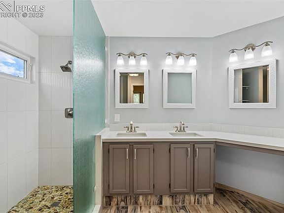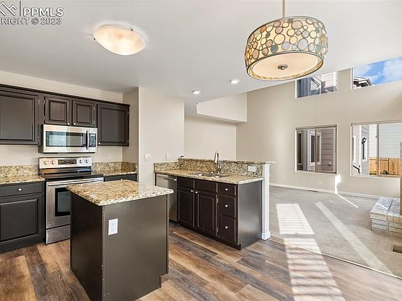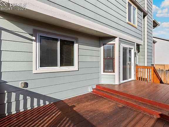 Welcome to your dream home! This stunning 5 bed, 4 bath property is a true gem. The desired Pinewoods neighborhood has easy access to the USAFA, I-25 and shopping. It is also walking distance to The Classical Academy Central Campus. Updates completed in the past few weeks/months include new roof and gutters, new garage door, new exterior paint and deck refinished, hardwood floors refinished. The main floor boasts both a spacious family room and a grand living room with soaring 18ft ceilings, creating an open and airy ambiance. Curl up by the cozy gas fireplace in the living room and enjoy the natural light from the large windows. The kitchen is a chef's delight, featuring sleek granite counters, stainless steel appliances, and an island with a breakfast bar. From here, step out onto the back deck through the kitchen, perfect for entertaining or simply enjoying the beautiful fenced in backyard. Upstairs, you'll find the luxurious master bedroom with vaulted ceilings, creating an inviting and relaxing atmosphere. The modern en suite bathroom offers double sinks, a walk-in shower, and a spacious walk-in closet, providing ample storage space. Additionally, there are two more generous bedrooms upstairs, along with a full bathroom that boasts double sinks, making mornings a breeze. The basement is fully finished and offers a comfortable family room, two more bedrooms, and a laundry space, ensuring plenty of room for everyone. This home truly has it all – ample natural light, a spacious layout, and exquisite finishes throughout.