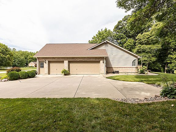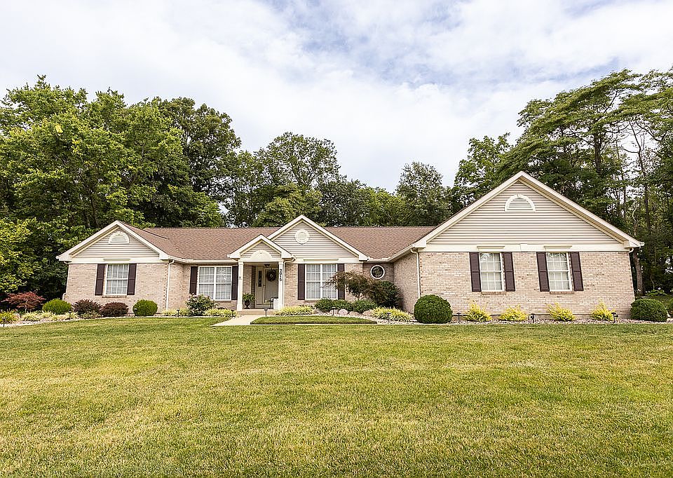 A must see home located in a desirable neighborhood, Manors of Woodfield. 3/4 acre wooded lot. Over-sized 3 car garage with extra wide driveway, a service door was added in garage for residential convenience. Single ranch home with no basement, 2382 square feet. A beautiful and meticulously landscaped lawn. The owner has taken great care of this immaculate home. Large eat-in kitchen with all appliances included. Kitchen snack bar for extra seating. Bay kitchen window with doors that lead to the deck for your private outdoor dining and relaxation. Several rooms feature vaulted or tray ceilings, crown molding, walk in closets in each bedroom along with ceiling fans, newly updated counter tops, vanities, floors, and light fixtures. All curtain rods, wood blinds and shutters throughout the home are included. Six panel solid wood doors throughout home. Large attic storage and many closets for extra storage. Professional grade surround sound system installed in living room. High Efficiency Furnace and brand new A/C and A Coil installed May 2023. Cozy shiplap brick fireplace with gas logs and forced air blower. Home security, professionally installed ground irrigation/sprinkler system, and home aeration.