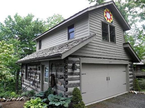 REDUCED BY MOTIVATED SELLER! Great sunrise views from this antique-log cabin. On the ridge, it enjoys a prime location w/breathtaking layered views. Cabin features vaulted ceilings, a trademark Stonebridge 2-story stone wood-burning fireplace, master on the main floor, lg family room w/wood stove downstairs & 2 bedrooms up plus a loft. This cabin is spacious & bright & each room enjoys the stunning view. Wide-board pine flrs, lg kitchen w/island seating for entertaining. There's porch or deck on 3 sides. In addition to all the space inside, there's a detached 2-car garage w/bonus rm upstairs.