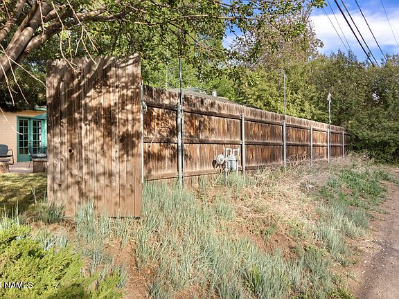 Location with a mid century modern home backing the FUTS & Rio de Flag. Single level with newer roof, exterior paint & 4 car concrete driveway. Garage was converted to bedroom/bath giving a second primary on-suite in addition to what came with the home when built. Kitchen is large with original re-finished wood cabinets and hardware, large and open with door to back patio and space to eat in. Additional family room with electric fireplace and room for dining table and solid hardwood floors. On demand water heater, dual pane windows, mature landscaping, trees and 2 exterior sheds. HOA is voluntary should owner want to join the neighborhood ''ditch'' pool.