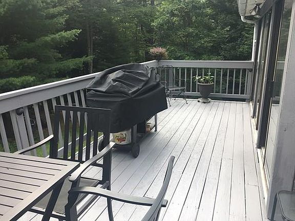 Just moments from town this cute cape is tucked peacefully away in the woods. This home is larger than it appears! 4 bedrooms, 2 full bathrooms, master bedroom is oversized and offers hardwood floors, 2 nice sized bedrooms upstairs, large family/rec room in the lower level with a walk out basement, lovely enclosed sunroom on the deck, plus additional entertaining area on the open deck, almost completely surrounded by the woods! You love the larger two door garage. Both house and garage roof were complete tear offs and new shingles with ice and water barrier, garage 1 year old, house 2 yr.