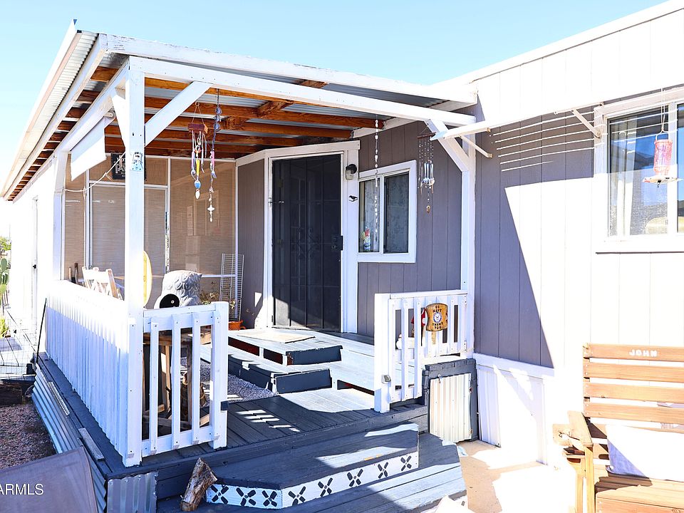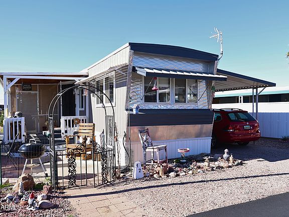 Enjoy stunning Superstition Mountain views from this charming 1 bed, 1 bath manufactured home in a welcoming 55+ community. A screened-in patio expands your living space, and the backyard offers a fruit-bearing lemon tree and a storage shed. Many furnishings convey, making move-in easy. Community amenities include a clubhouse, pickleball, pool & spa, and shuffleboard—perfect for active, low-maintenance living in Apache Junction.