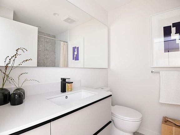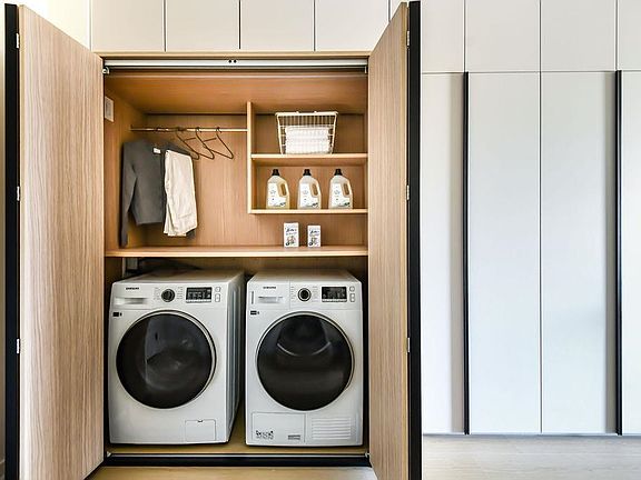 DEVELOPER FINAL HOME. Discover hue by Marcon, a community nestled in Port Moody, surrounded by nature and complete with modern conveniences for contemporary living. This south-facing, top-floor 1 Bedroom home features 35 feet of linear custom millwork storage designed to maximize space. The kitchen is outfitted with a sleek Liebherr refrigerator, Fulgor dishwasher, and AEG gas cooktop with a seamlessly integrated speed oven. A built-in dining table for four makes entertaining effortless, while the side-by-side washer and dryer—with a folding table, extra storage, and overhead drying rod—adds everyday convenience that is typically found in a single-family home. Step out onto your private balcony and savour serene views of the tranquil courtyard and surrounding natural forest of Port Moody.