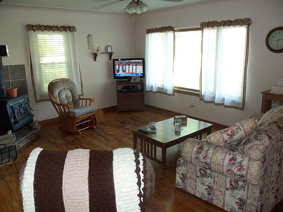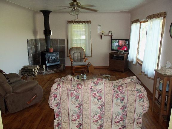 Price reflects need for some exterior TLC including shingles. 1 acre lot with huge backyard, no neighbors behind. Large eat-in kitchen and spacious living room offer an open floor plan. Hardwood floors, most windows have been replaced, fresh paint in most rooms, wood burner in living room, large attic area with stairwell access offers tons of storage. Tile backsplash in kitchen. All appliances remain. Huge attached garage has a separate 18x16 heated workshop area. Large cedar coat closet.