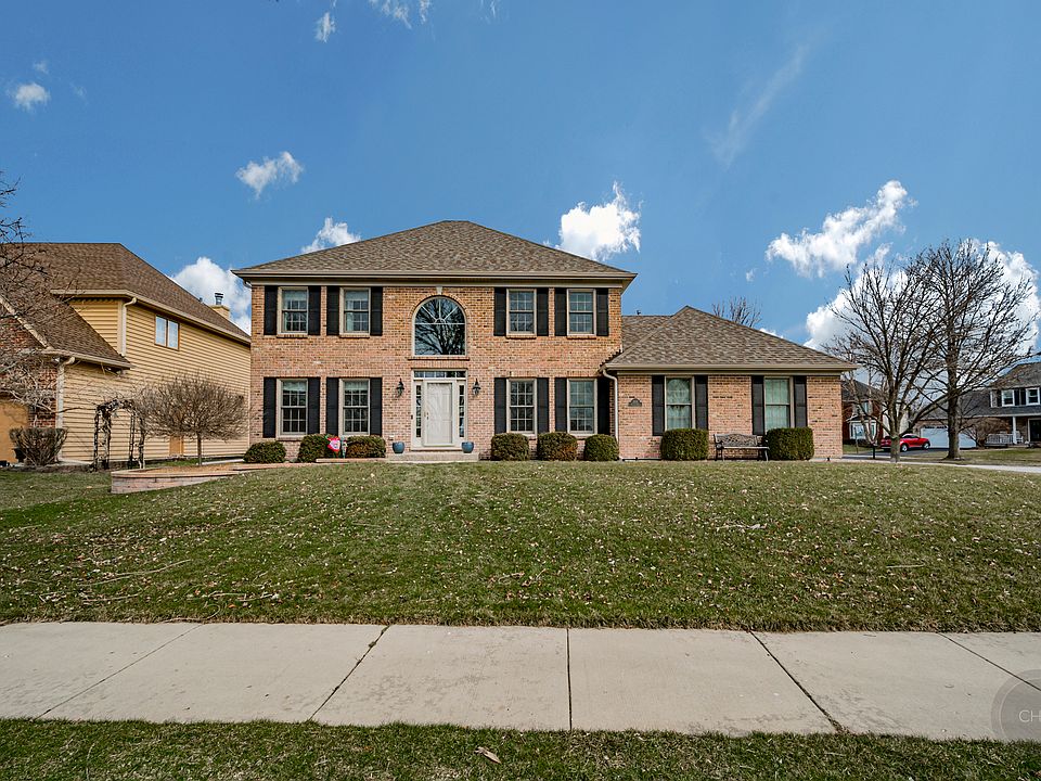Brick Georgian with 3 car heated side load garage sitting on one of the largest lots in the subdivision. Your new home features a 2-story foyer with hardwood floors through kitchen area and powder room, neutral paint and white woodwork. Spacious Living and Dining Rooms flank the foyer. Living room has a double French door leading into the Family Room. Open concept across the back of the home ideal for a family and entertaining. Family room extras include bump out overlooking the paver patio, gas log fireplace, Bose surround sound and crown molding. The family room is open to the eating area and kitchen. Kitchen includes newer stainless appliances with double oven range, island, under cabinet lighting, planning desk and pantry. Main floor laundry with additional cabinets and utility sink. Oversized primary suite features hardwood floors, crown molding, wide base board, luxury bath and walk-in custom closet with organizers. Secondary bedrooms are all generous in size and share hall bath with double sinks and separate tub/shower/commode area. Full finished basement has office/den area with double French glass doors, gas log fireplace with adjacent cabinets with glass fronts, upscale paneled walls and ceiling and built-in desk area. Media room with wall of shelves and centered TV area perfect for your large screen TV. Open shop area with built-in cabinets and work area is perfect for a crafter, model designer, woodworker or whatever your needs may be. Hydraulic sump pump backup, The garage enthusiast will appreciate the built-in cabinets, hot and cold water access, heater, and attic pull down. Paver patio with professional landscaping and sprinkler system. This home has lots of NEWS including Siding, Roof, Gutters and Marvin windows 2019, A/C, furnace and humidifier approx 10 years old. Elementary school located in the subdivision and Middle and High School nearby. Easy access to shopping and restaurants along Rt. 59.