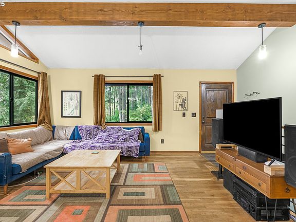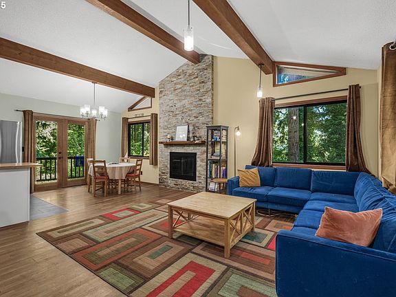 Welcome to your secluded sanctuary in Gerber Woods! On nearly half an acre and surrounded by lush, mature trees, this beautifully renovated 2-story home offers peaceful privacy with modern style and comfort. Fully updated in the last two years, including a new A/C and forced air unit, new energy efficient windows throughout and all modern light fixtures, this 3-bedroom, 1.5-bath home blends rustic charm with contemporary upgrades. Step inside to find an open-concept main level with solid hardwood floors and abundant natural light. The spacious living room features vaulted, beamed ceilings and a dramatic floor-to-ceiling stone fireplace. The kitchen has tile floors, stainless steel appliances, butcher block countertops, and flows into the dining area with French doors leading to a covered upper deck with partial views of Beaver Lake. All three bedrooms and a full bath with tub/shower are conveniently located on the main level. Downstairs offers a large bonus room with rich wood and beamed ceilings, another striking stone fireplace, a half bath, laundry room, and walk-out access to a peaceful patio. Outside, enjoy serene country living with plenty of space to unwind with a shed, and raised garden beds. All this tranquility is just minutes from dining, shopping, and the Oregon City Golf Course. A rare gem offering privacy, beauty, and convenience.