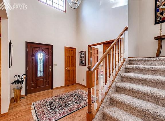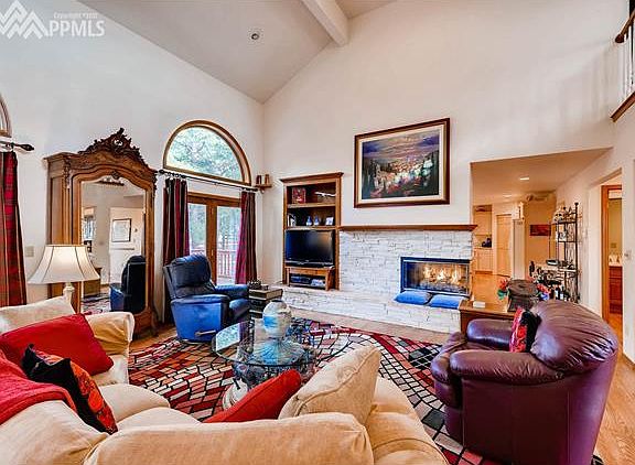 Stunning two story nestled in the towering pines of Woodmoor with gorgeous mountain views. Welcoming covered front porch opens to a two story open foyer with lots of natural light & hardwood floors that flow through most of the main level. Features include a vaulted great room with a stacked stone fireplace and walk-out to the large deck; ideal for entertaining. Formal dining room with crown molding, cheerful gourmet kitchen w/ center island, unending prep space, gas cooktop, wall stove, pantry, counterbar, and a spacious eating space warmed by the gas fireplace. The vaulted master suite features a sitting space w/ bay window that perfectly frames the mountain views, adjoining five piece master bath with jetted tub and large walk-in closet. Upstairs, a walkway looking out over the great room leads to three bedrooms and a full bath and stunning views from every room. The walk-out lower level features a spacious family room with wet bar, wine cellar, a crafters "dream" room with cabinets and counter space, a secluded office with built-in shelves, natural light and French doors for privacy, a fitness room and a quarter bath. New roof in Oct. 2017, two furnaces, two water heaters, multiple outdoor living spaces and so much more! Don't miss it!