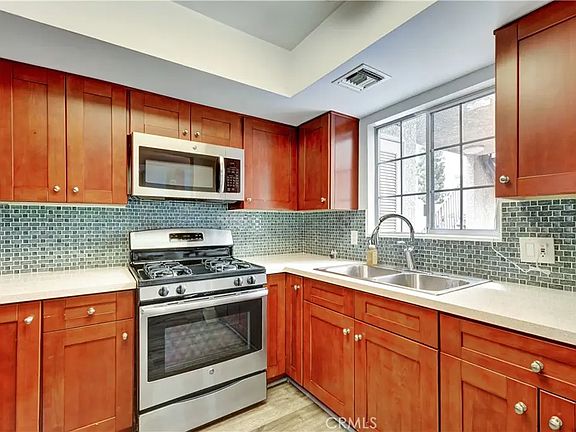 Welcome to this beautifully updated 2 bedroom 1 1/2 bathroom townhome offering stylish comfort. The home boasts an open-concept living and dining area, complemented by laminate flooring, a cozy fireplace, high ceilings, and a glass sliding door leading to the front patio. The renovated modern kitchen is equipped with stainless steel appliances, quartz countertops, and custom cabinetry. Upstairs, you'll find two spacious bedrooms with ample closet space, the main bedroom has a walk in closet, both bedrooms open to a large balcony offering views of the mountains. In unit laundry closet. Detached two car garage. The community is gated and includes a sparkling pool and spa, recreation room, lush landscaping, and guest parking. The home is centrally located in the heart of the San Fernando Valley, close to shopping, restaurants, transportation, and schools.