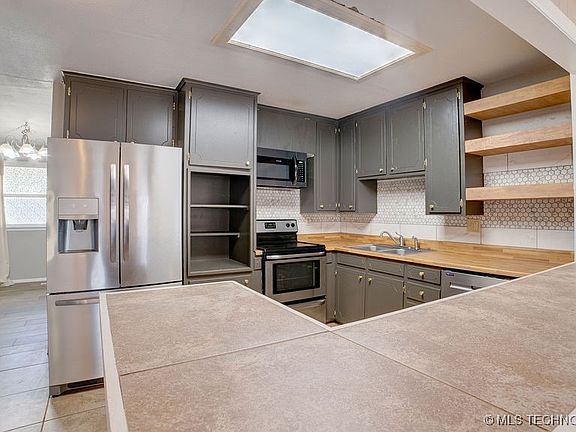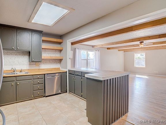 >Extra large family room with new LVP and wooden beam accents > Open shelving in kitchen with updated backsplash >Updated tile >Updated tile for surround in hall bathroom >Accent wall in primary bedroom > Updated tile shower in primary bathroom >Privacy fence with covered patio > Great location, easy access to shopping and highways.