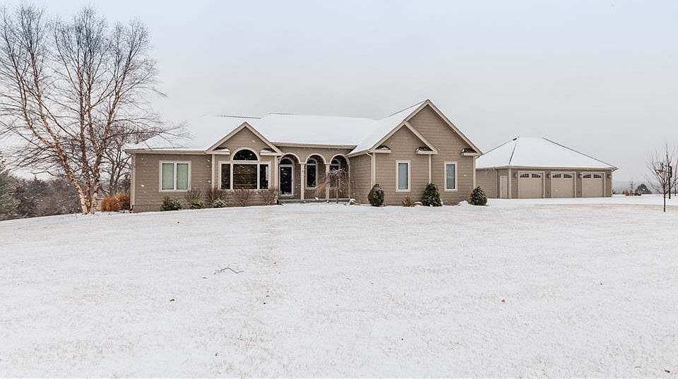 Looking for an acreage within 15 min to WDSM with 5+ garages (shop space)? With 3200 sq ft of finish, this 4 bed, 4 bath home offers lots of space including a home office space with built in cabinets, large great room, eat in kitchen, formal executive style dining room and main floor laundry. Master suite includes whirlpool tub, large tile shower and walk in closet. Bedrooms 2 and 3 have a Jack & Jill bath with separate vanity space for each bedroom. Newly finished lower level includes large bar, theater, gaming area, bedroom and bath with tiled shower and large storage space. Over-sized covered deck and patio fire pit area great for enjoying rolling hills, beautiful sunsets and wonderful views of the large tree lined property. Bonus is the exterior garage space just steps from the house. 3+ car garage, work space, or shop area for many types of businesses/hobbies. There is so much more that this property offers. It is a must see! (Basement finish sq ft per seller.)