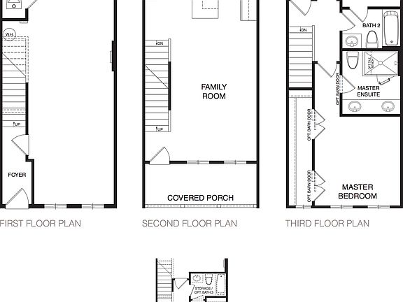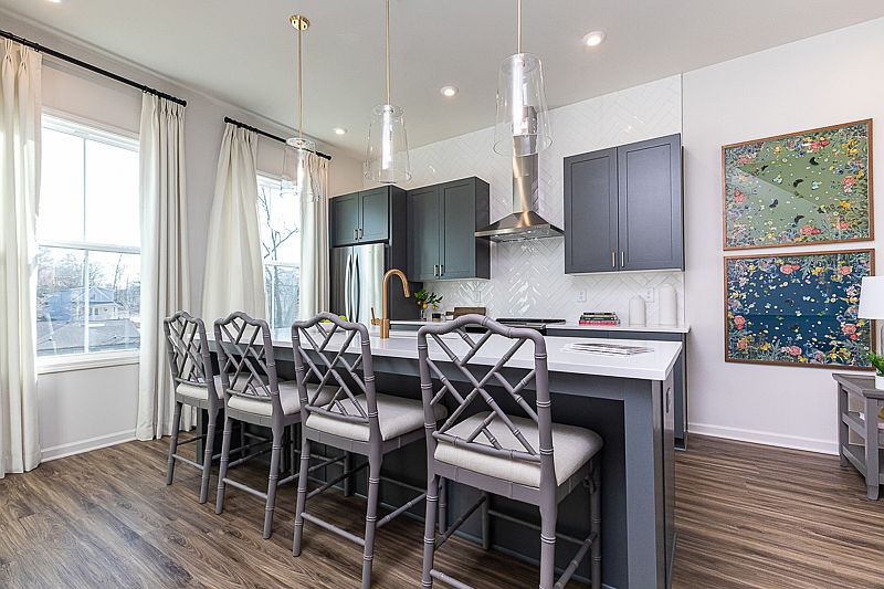 The Middleton floorplan features open concept living on the middle floor with an oversized kitchen island anda covered porch. Chefs and entertainers alike will enjoy the spaciousness of the kitchen and connected family room, and the built-in kitchen pantry offers an abundance of storage. The top-floor offers a private owner's suite and bath with a secondary bedroom and bath for a roommate or guest. The first floor includes a garage and an optional flex space, per plan. Colorful exteriors bring vibrance and the unique character of Kirkwood into this new neighborhood.