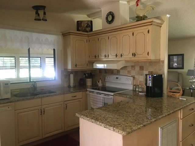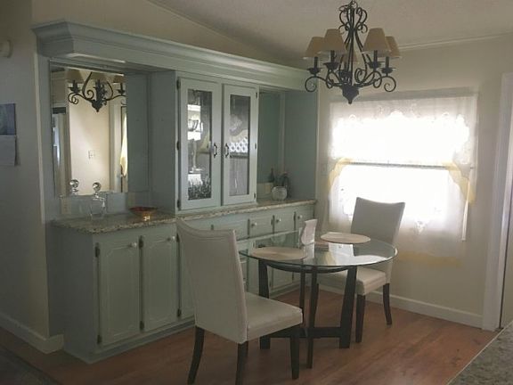 Beautifully maintained 1064 sq ft home with 2 bedrooms, 2 full baths, fresh paint includes new and quality touches. Move in and enjoy the 10 x 20 Florida Room with the breeze through the windows (new plantation shutters) and cool it with the wall AC unit in the summer. Kitchen features solid wood cabinetry and granite, pantry, side by side fridge and newer flat top stove. Dining area with built-in for beautiful storage. Laminate and tile throughout. New roof (March 2016) with transferable warranty. Covered parking and storage area with laundry (washer is 2 years old). Regularly maintained Carrier AC unit. Sprinkler system for lawn. Monthly fee of $597 includes taxes, water, trash, lawn mowing and amenities. Free storage for boats/trailers. This 55 and over community is close to beaches, Mercato, shopping and includes clubhouse, community pool, shuffleboard, adding horseshoe pits and more to come.