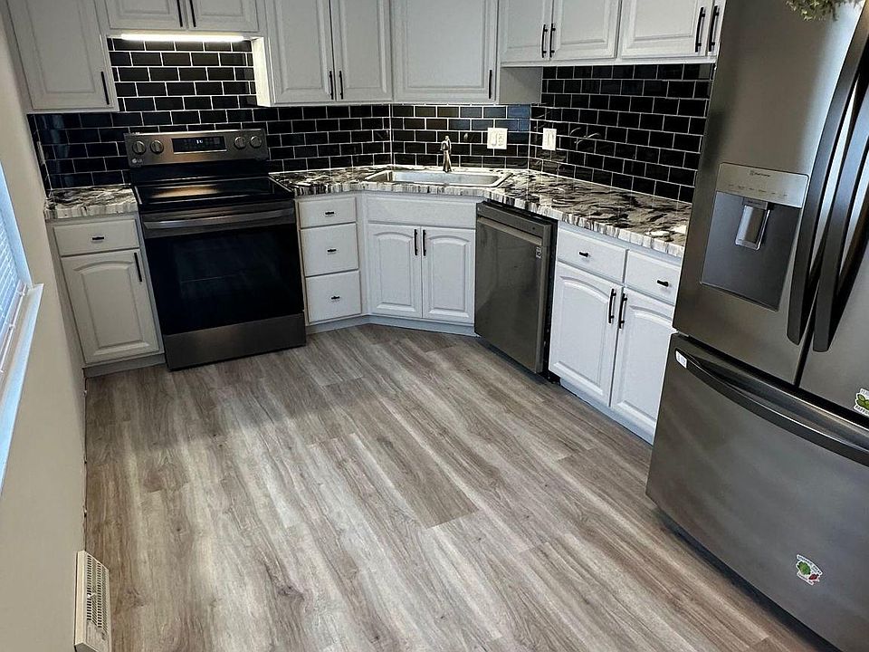 Kitchen has luxury flooring, amazing countertop, new appliances fridge, stove, dishwasher, new sink and a beautiful black backsplash. Very spacious for a eat-in kitchen and plenty of cabinet space.