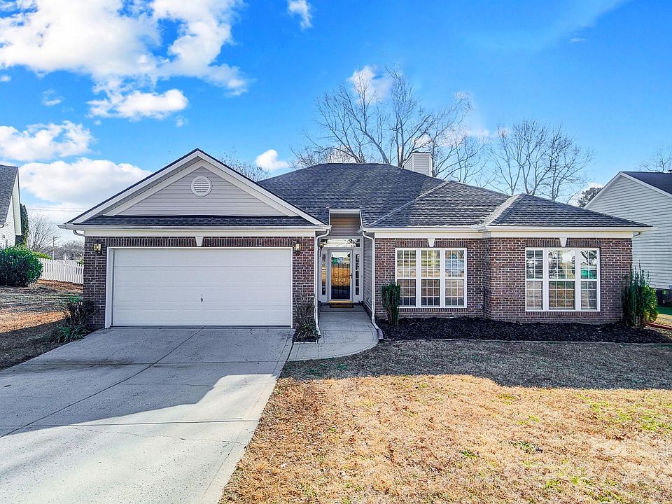 Welcome to this stunning single-family ranch in sought-after Olde Sycamore! Spacious living room features a cozy gas log fireplace w/gleaming hardwood floors. Sunlight streams from the expansive windows that surround the living room and kitchen boasting an island and breakfast bar providing views of the back yard. Large Sunroom off the kitchen is perfect for entertaining. The spacious primary suite includes an ensuite bath while two generous secondary bedrooms at the front of the home share access to a full hall bath, ideal for guests. Enjoy outdoor living on the partially covered back patio and fully fenced backyard. Conveniently located just minutes from dining, shopping, and I-485! Home Warranty provided by seller.
