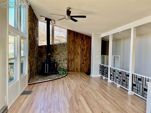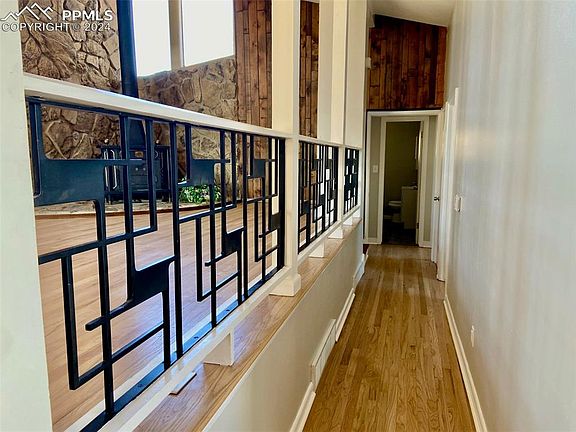 A rare architectural design in this completely remodeled, centrally located, MID CENTURY MODERN home! So many features: NEW interior & exterior paint, NEW energy saving vinyl windows, NEW light & bright white shaker cabinetry in kitchen & bath, NEW high level granite kitchen countertops, NEW gleaming white back splash, & NEW big stainless kitchen sink, NEW stainless steel appliances, NEW refinished eye catching oak hardwood floors throughout except entry & bath (which have luxury vinyl planking). No carpet anywhere. NEW hardware, NEW light fixtures, & NEW interior doors. Great room has vaulted ceiling with floor to ceiling windows, plus unique floor to ceiling stone wall frames the wood burning stove, angled windows, mid century wrought iron railing, & warm aspen paneling. 4 NEW ceiling fans in each bedroom & great room. VIEWS, VIEWS, VIEWS of Patty Jewett Golf Course, sweeping mountain views from Cheyenne Mtn to Pikes Peak & a spectacular view of downtown Colorado Springs. Walk out to a large composite deck with amazing views & a large fenced backyard with alley access. The basement has a spacious laundry/mechanical room with sink & a separate room for a workshop, exercise, storage or crafts plus a 1 car attached garage. Less than 1 block to the Rock Island Trail for walking/biking and the beautiful Palmer Park is a short drive/bike away. Close to shopping & restaurants. This location is perfect for everything you need. Mature lilac bushes in the backyard with large pines in the front. No HOA, keeps your expenses low. RV parking on the side of the house. WELCOME HOME!