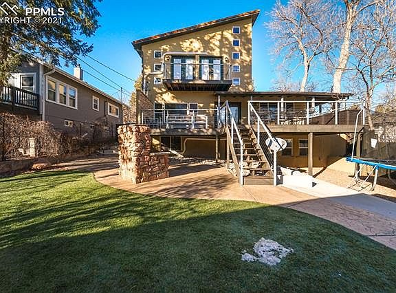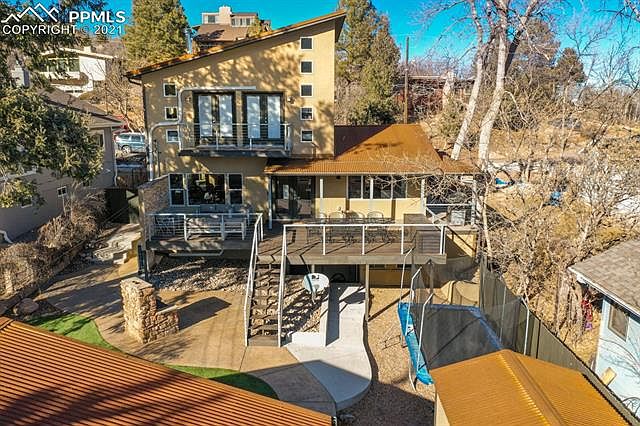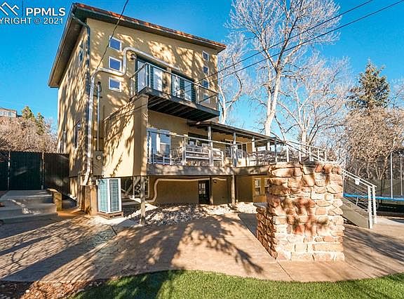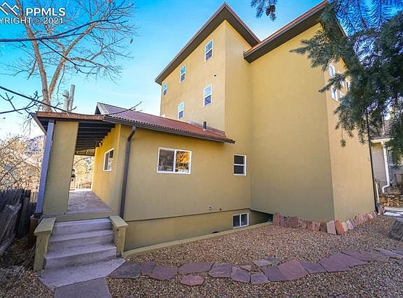 Truly spectacular Cheyenne Canon beauty with million dollar views! Exterior main house is full stucco with stone accents and a massive Brazilian hardwood deck. Full Xeri-scaped yard with storage shed and oversized 2 car insulated garage plus two more off street parking spaces. Heavy gauge Corten metal roof with 50+ year life expectancy. Super light and bright main level with tons of windows and beautiful hardwood floors. Morso Scandinavian wood heating stove plus radiant heating as well as 5 split A/C units to keep you cool. Large gourmet chef's kitchen with granite tile counters, custom lighting, and full stainless steel appliances. Dedicated dining area with more amazing views. Upper level features two master suites with private baths and walk in closets. One of the bedrooms features an upper level loft. Both suites share access to upper level deck with stunning views of Cheyenne mountain. Full finished walk out basement accessed by a really cool spiral staircase. Basement bedroom has its own bathroom as well as big closet and office area. Basement family room has future potential as a bedroom as there is room to add a closet. Custom metal railing on the deck which carries into the staircase and railing inside. New electric panel, 3 ceiling fans, RV plug-in and outdoor wood fireplace. 50 yards from Stratton open space and great hiking trails.