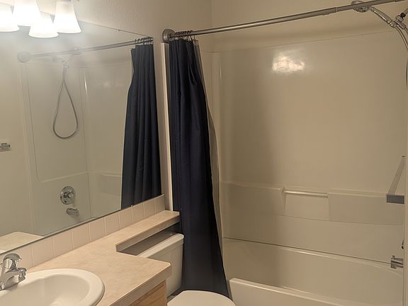 2nd story bedroom and bathroom with shared kitchen, living room, and half bath. The bedroom features soft neutral carpeting and walls and includes two closets. One wide closet with sliding doors for easy access and a second deep closet with a lock for secure storage. A north-east facing window fills the room with gentle morning light and provides a peaceful view overlooking a field. The private bathroom offers generous storage, including an additional closet with built-in shelving as well as drawers and cabinets. A long counter and wide mirror extend across the room, providing plenty of space for daily routines. At the far end, a full bathtub with showerhead and curtain completes the space. The shared main floor includes a furnished living room, kitchen, and half bath. The living room offers a comfortable reclining couch, television, and a fireplace making it a cozy area to relax or unwind. The kitchen has an open U-shaped layout and comes equipped with a glass-top electric stove, oven, microwave, refrigerator, and dishwasher, along with shared cabinet space for storage. A washer and dryer are located in the basement for resident use. The neighborhood connects to the Loveland loop trail, and is located near Fort Collins and the mountains. No cigarette smoking. Smoking allowed on patio. Vaping allowed indoors. Lease duration negotiable between monthly or 1 year contract. Small pets accepted so long as they are clean and non-destructive. Modifications/improvements can be discussed. Respectful cleanliness of common areas and responsibility taken for any damages expected. Parking is in parking lot.