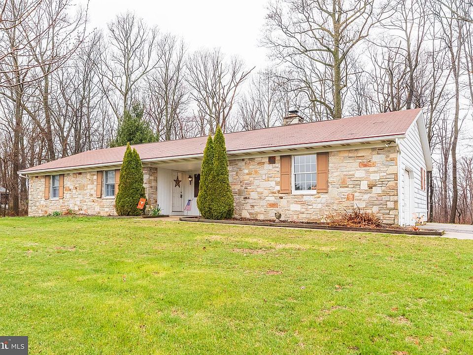 Move right into this lovely Stone Rancher. Cozy Living Room with Bay Window, Wood Burning Fireplace & Wood Floors. Kitchen has Separate Breakfast Room, Large Sunroom Addition with Vaulted Wood Ceiling & Fan, has separate Heat/AC. 3-4 Bedrooms, 2.5 Bathrooms. Master Bedroom has Private Full Bath. Laundry Room on Main Level with Lots of Extra Cabinets for Storage. Side Load Garage & Large Driveway/Parking Pad. Clean unfinished lower level waiting for your ideas! Totally Private 1 Acre Yard Backs to Trees! Cul-de-Sac too!