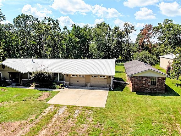 Great location-3BD, 2.5BA, 2,068 SF home on 5.13 acres! Open floor plan design, large bedrooms, 2x6 insulated walls, additional storage, including dual pantries & a wood-burning stove vented throughout. Hardwood in entryway & LR, carpet in bedrooms & tile in wet areas. Office offers a quiet retreat for reading/working from home. Eat-in kitchen w/ granite counters, breakfast bar, SS appliances & lots of cabinets. Oversized, 2-car garage, utility/mudroom w/ ample storage & lockers. Primary suite features tray ceiling, walk-in closet, soaker tub, separate dual vanities & walk-in shower. Outdoor features a pergola-covered patio, 30x50 shop w/insulated overhead door & electric, raised garden beds, chicken coop, fruit trees & grape/blackberry vines. Outbuilding has an irrigation pump. Rural water for house & well for yard. Whole-home 22kW Generac generator, upgraded electrical, 2021 HVAC w/ smart thermostat. Brick outbuilding offers guest/in-law suite potential, or make it a screened-in entertaining area! Survey avail.