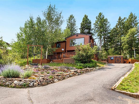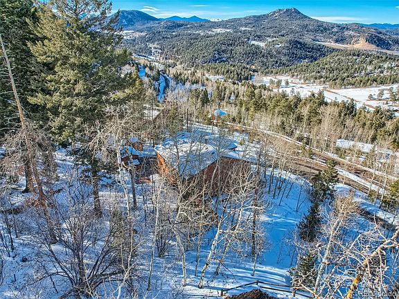 Spectacular views from every window can be yours from this home! You'll be impressed by the 180 degree unobstructed views, from the snow capped peak of Mt Evans to the city lights of Downtown Denver. The one acre property offers lots of places to enjoy the outdoors, including walking paths and a disc golf course. The spacious deck provides ample area for seating and a hot tub to soak in after a long day of recreating. Be sure to sit in the genuine ski lift swing while admiring the views! As you head indoors, you'll enter the the main level with an open concept great room perfect for entertaining. The vaulted ceilings make the room feel extra spacious. The kitchen includes stainless steel appliances, a gas range and lots of countertop space for meal prep. Admire the views as you dine near the oversized 10' x 5' picture window that frames the front range foothills. The Quadra Fire wood stove on the main level and Lennox gas stove downstairs both keep the home cozy! The lower level includes stained concrete flooring and an alternate exterior entrance from the driveway. Note the lower level bedroom includes a "cloffice" that can easily be changed to a walk in closet with tons of storage in addition to the existing second closet. The exterior was just painted, the home has brand new windows, a new roof and all new carpet. The two sheds provide lots of storage. Mountain perks: paved roads in neighborhood are county maintained and on school bus route, easy drive with no stop lights to Denver and DTC, minutes to retail and dining amenities in Aspen Park, easy access to Jeffco Parks and Staunton State Park. Make this house your home today!