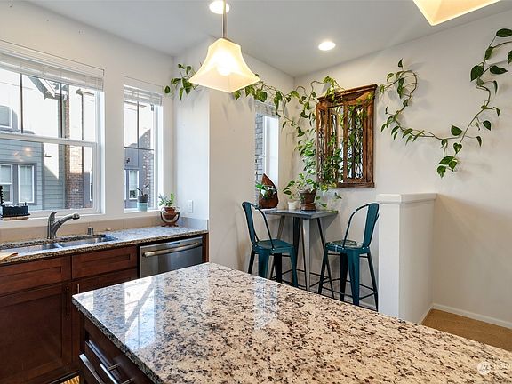 Light & bright South facing lake view craftsman townhome across from Silver Lake. This open spacious floor plan boasts a den (3rd bedroom) & powder room on the main entry level & two Primary Suites on the upper floor with individual baths & laundry. The main floor features a large open floor plan with 10' ceilings & engineered hardwood flooring, perfect for entertaining. Kitchen with slab granite counters, stainless appliances including gas stove top, prep island, plenty of storage, counter space & work nook. Dining area and living room with fireplace and access to view deck. One car garage + tankless hot water. Security entry gate, park & easy access to Silver Lake & trails. Close to freeways, Costco, Boeing, transit & conveniences.