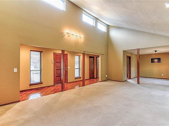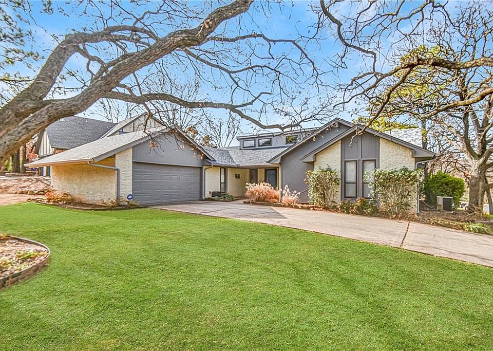 This unique mid century designed Edmond home is sure to win over your heart! This home has a brand new high impact roof that will save its new owners on insurance. The spacious living room features a stone fireplace and tall ceilings to make the space look even larger. The sprawling master suite includes its own private en suite with modern glass front barn doors, a granite vanity, and a large walk-in closet with built-in storage. The secondary bathroom offers tons of added storage and a double vanity while other great features in this home include the large windows and second dining space. Outside, mature trees and a decorative pond create a gorgeous landscape with two covered patios and a hot tub to enjoy a relaxing evening outdoors.