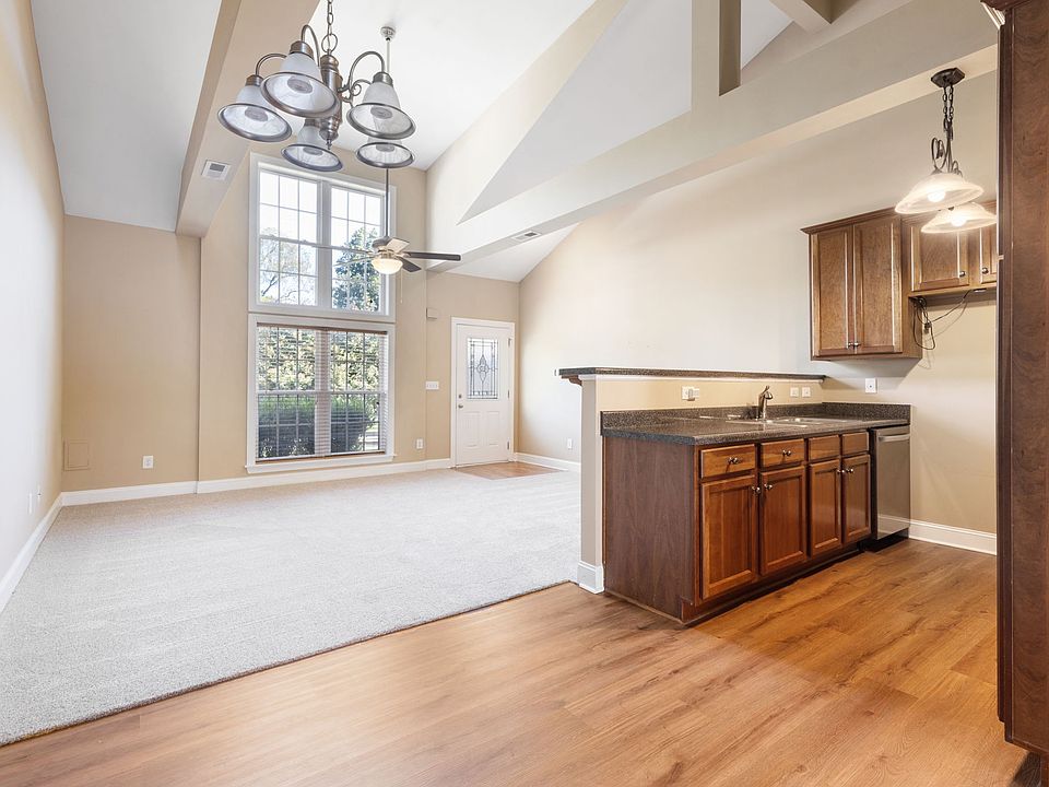 This well-maintained townhome in the Woodlands at Spring Hill community is complete with thoughtful updates throughout, including fresh paint, new flooring and carpet throughout, and additional cabinets. The welcoming entryway features crown molding and a hall closet, leading to a spacious living room, cozy breakfast nook, and upgraded kitchen with pantry and bar-height seating.