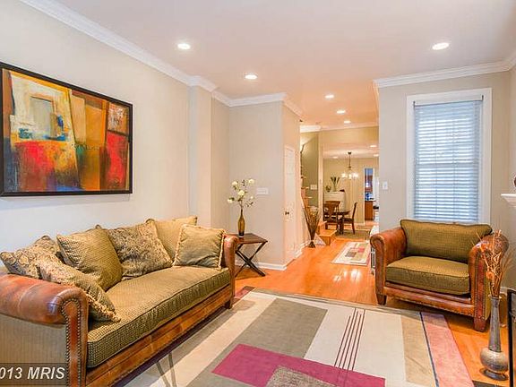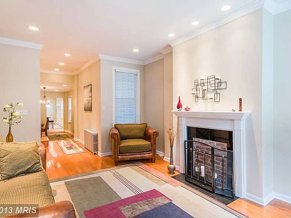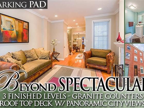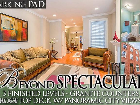 SPECTACULAR BUTCHERS HILL ROWHOME WITH 3 FINISHED LEVELS & PRIVATE PARKING! Hw floors throughout, LR w/ dec fireplace, sep DR, designer island kit w/ granite counters, ss appliances & tile backsplash, 2nd level w/ 2 large bedrooms & full bath w/ dbl vanities, whirlpool tub, & sep shower, 3rd level Master suite w/ sitting room w/ full bath, rooftop deck w/ water & city views & priv parking pad!