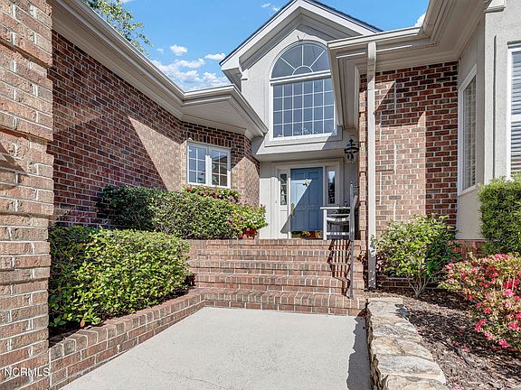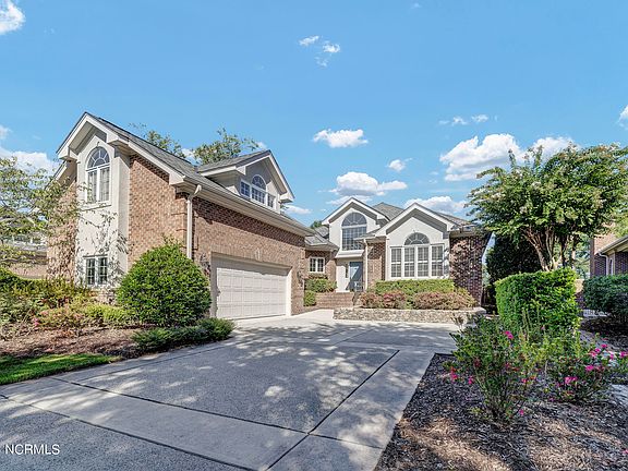 Overlooking Landfall's Jack Nicklaus designed ''Ocean'' golf course, this brick villa features over 3,000 square feet of tasteful design and custom features. The open floor plan includes combination living and dining room with trey ceilings, hardwood floors, a masonry gas logs fireplace. The dining room opens to a lovely walled courtyard and the living room features floor to ceiling glass overlooking the 25' by 11' covered porch. Combination golf and water views of holes #7 and #8 provide a peaceful setting and perfect backdrop for spectacular sunsets. The kitchen has been updated with quartz counters and ocean glass ceramic backsplash.