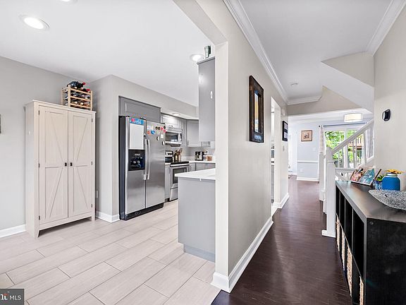 Discover this stunning 3 bed, 2.5 bath townhome located in the sought-after Greens at Smith neighborhood in Broadview. Upon entering, you'll be greeted by a welcoming and cozy interior, featuring a refreshing, modern color scheme, hardwood flooring, crown molding, and abundant natural light. The large dining and living rooms offer ample space to unwind and relax, highlighted by a bump out for added space, gorgeous oversized windows, and three statement skylights in the vaulted ceiling, all of which open to the sliding glass doors leading to the back deck and ground patio, which is perfect for outdoor dining and enjoying an evening fire. The large living and dining rooms seamlessly connect to the kitchen through a pass-through window, creating the perfect setting for entertaining or enjoying casual meals. The kitchen is a chef’s dream, featuring quartz countertops, sleek cabinetry, designer ceramic floor tile, an oversized refrigerator, and stainless steel appliances. The breakfast nook just off the kitchen, filled with sunlight, offers an inviting space for morning coffee. A convenient powder room completes the main level’s charm. Upstairs, the primary bedroom serves as a peaceful retreat, featuring vaulted ceilings, a walk-in closet, and an ensuite bathroom with a soaking tub, walk-in shower, dual-sink vanity, and a skylight. Two additional bedrooms, also with vaulted ceilings, share a second full bathroom down the hall. The finished lower level offers a spacious family/recreation room with a cozy wood-burning fireplace, providing plenty of room for activities. Additionally, the basement a utility/laundry/storage room housing the water heater, washer, and dryer, with plenty of storage space and shelving for seasonal items, sports gear, and more. Located in the heart of Pikesville, this home is just minutes away from shopping, dining, and entertainment options, including Quarry Lake and Mount Washington. With easy access to I-83, I-695, and I-95, commuting is a breeze. Nothing to do but move right in! Redistricted to Summit Park Elementary for the 2024-2025 school year.