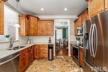 This gorgeous home in Knightdale, NC offers 3 bedrooms and 2 and a half bathrooms. The large front porch is inviting and great for sitting in the evening. Open floor plan with great natural light and inviting living spaces. You will love being able to host guests in the family room or out on the covered back porch, there's also a patio in the backyard. First floor master with en suite and soaking tub. Master bedroom also has a private entrance to the back porch. First floor is all hardwoods. Large bonus room upstairs. Two car garage. Unfurnished. No smoking. Credit check required.