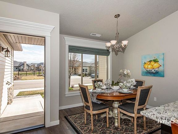 Care free living in prime location of Movado Subdivision built by BLACKROCK HOMES. One of the best home locations in subdivision; this patio home is on open corner lot w/common area on 3 sides; provides open spacious feel. Open plan features vaulted ceiling with large kitchen w/island, granite countertops, raised bar and double pantry doors. Luxury vinyl plank flooring through entry, dining, kitchen and hallways. Sunny front dining and front porch. Master Suite w/dual vanities, walk-in closet & separate shower area. Water softener. Nice sized partially covered private patio and all fenced back yard. HOA maintains front and back yard lawncare. Community Pool and Walking Paths. Walk to Silverstone Business area with access to restaurants. Across from Hospital/Medical, Top Golf and Freeway Entrance. Minutes to Airport, Village Shopping Center, Water Park, Movie Theaters, Downtown Boise, BSU and Micron. Perfect central location in upscale Movado Subdivision.