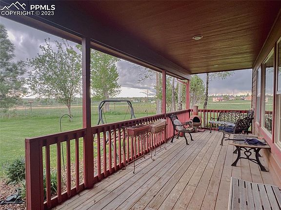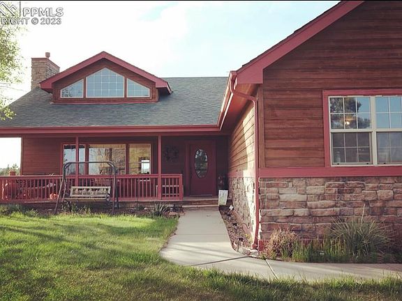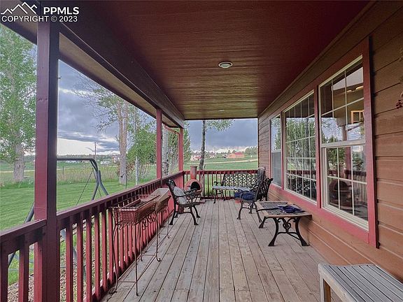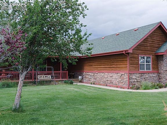 Welcome home to your classic chalet Colorado Ranch home! Enjoy privacy and the quietness of the country. Featuring all wood log style exterior with a covered front porch boasting views of Pikes Peak. Walk into an open living room area with plenty of Colorado sunlight throughout. Master bedroom is on main floor with private access to deck overlooking a meadow and horse stables to always keep an eye on your four legged companions. This property also allows for 2 horses to live wonderfully in the beautiful barn. Back yard has fenced area for pets and kids as well as an entertainment area with pergola! Not only do you get to enjoy quiet evenings with beautiful trees surrounding the home, you get your own basketball sport court!