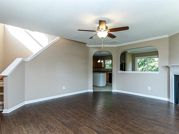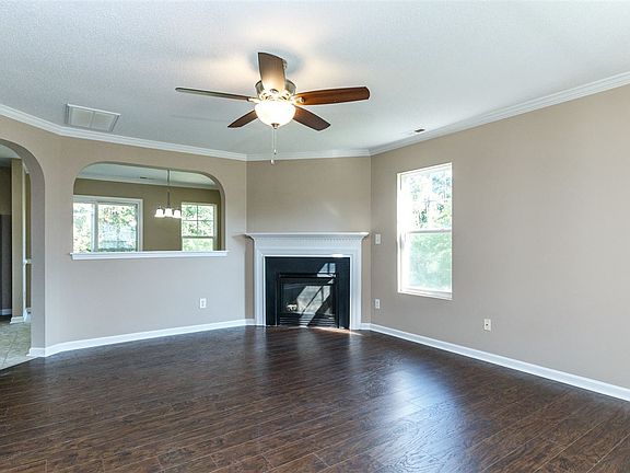 Move in ready home w/stone & shake accents in a pool community! Large rocking chair front porch. Guest bedroom on Main floor. The open kitchen has tons of counter top space, a center island and microwave. Separate dining w/crown molding & chair-rails; Open, spacious family room w/corner gas log fireplace, laminate hardwood floors; spacious MB w/over sized WIC, private bath w/separate shower & garden tub. Other features include large deck, fenced in private yard that backs up to natural tree buffer.