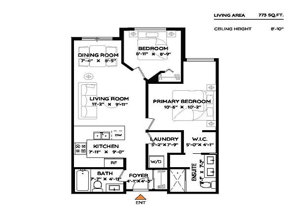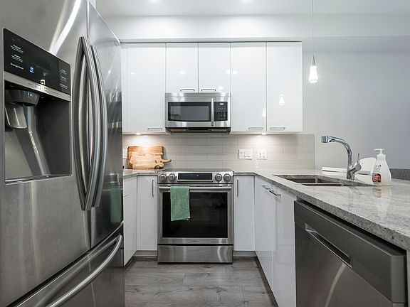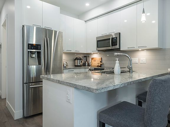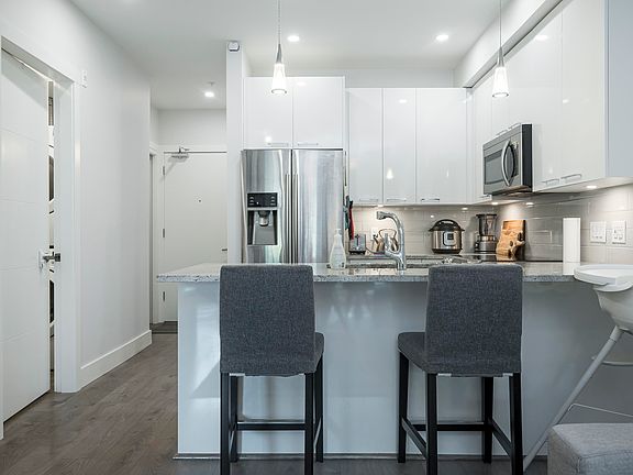 The Benjamin located in a great area of Langley City, with walkability to everything, offers this 773 sq ft 2 bdrm, 2 bthrm home with a spacious, open floor plan. Kitchen has gleaming high gloss white cabinetry, S/S appliances, quartz and peninsula workspace with seating for 4. A/C keeps the well sized primary bedroom cool in the hot summers and the walk through closet leads to the 4 pc ensuite. There is generous storage in the actual walk in laundry room! There is another large bedroom and 4 pc main bath. The living rm leads to the oversized patio where you can walk out to the courtyard making it a quiet outdoor space! Easy access for pets with a fenced dog area on site! Amenities include a gym and party room in this well cared for complex. 1 parking, 1 storage ~ call today to view!