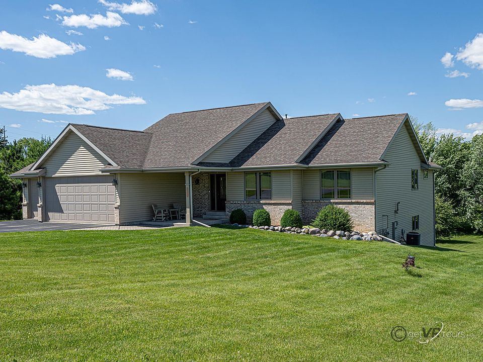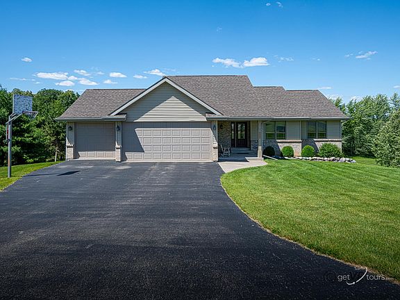 Spacious custom-built ranch on 2 acres in Silver Springs Subdivision. Expansive living room with vaulted ceilings and Acacia wood floors opens to the bright eat in kitchen with oak cabinets giving ample storage, stainless steel appliances, and Corian counter tops. Deck has plenty of room for grill and table and looks out onto the park like yard with multiple fruit trees. Main floor master bedroom with tray ceiling has a private bathroom and walk-in closet. There is a convenient laundry space off of the 3 car which has an additional workshop area. Full finished walk out basement has a bar for entertaining and a fourth bedroom, bathroom, workout/weight room and storage room with shelving. Well maintained home in the Dakota School District 201.