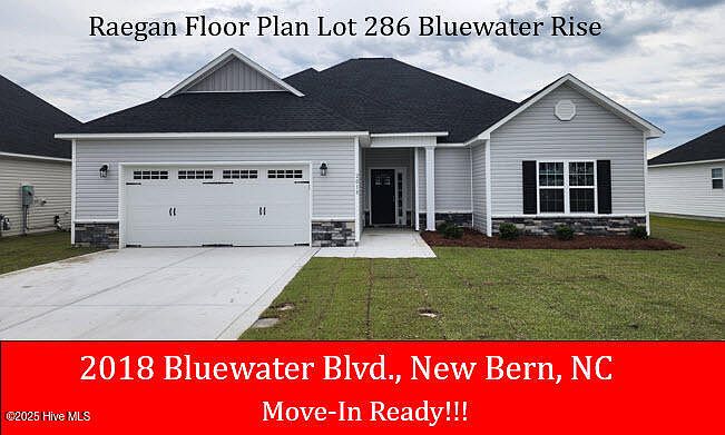 The ''Raegan'' floor plan is now ''Move-In Ready'' in Bluewater Rise. Builder offering $10,000 buyers closing cost assistance! Features include granite counter-tops, gas log fireplace, covered back porch, trey ceilings in the family room & master suite with his & hers closets! Creekside school district! Minutes from downtown New Bern & Cherry Point MCAS.