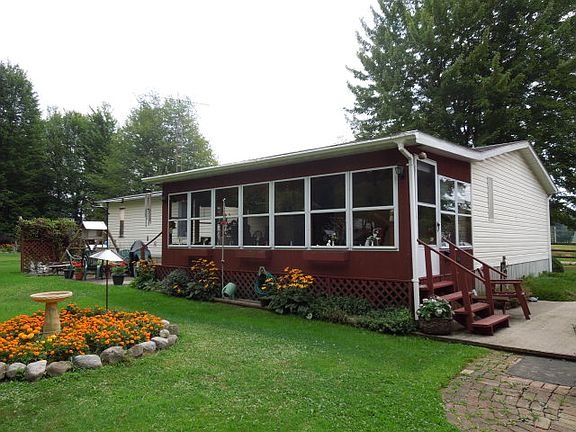 Lovely & spacious 1995 Dbl. wide MH on 4 lots in Shenango Lakes Allotment. LR w/woodburning FP, DR, Kitchen, 3 BR, 2 baths, great enclosed back porch & covered front porch plus outside patio, detached 2-car garage w/att. shed. Nicely landscaped yard with split rail fencing. Great country like setting. ($89,000)