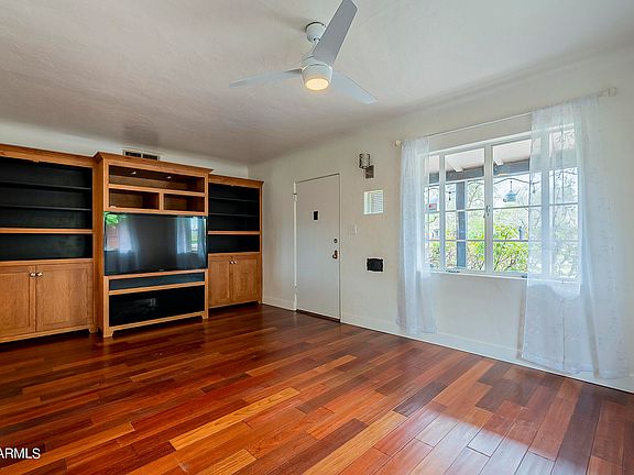Stunning historic home nestled between downtown and midtown Phoenix. Charming 1940s brick home. Brazilian Cherry hardwood flooring throughout. Coved ceilings. European style maple cabinets in galley kitchen, circular stainless sink, stainless appliances including Thermador gas range. Bath with maple cabinets, travertine flooring, tumbled stone tiled shower and seamless glass shower door. Built-in entertainment center in living room. Exposed brick wall in Dining area. High baseboards. Milk delivery slot remains. Relax on the large back porch. One car garage in back for your storage needs or a big workshop. Short walk to Encanto Park, tennis and pickelball courts, volleyball, soccer fields, public pool, and much more.
