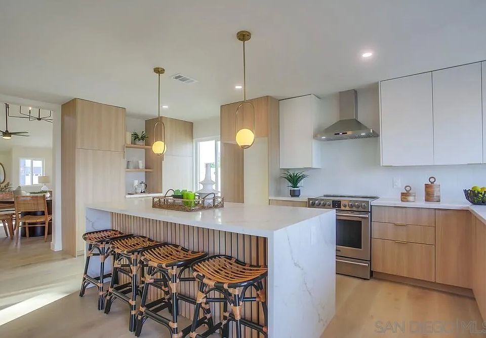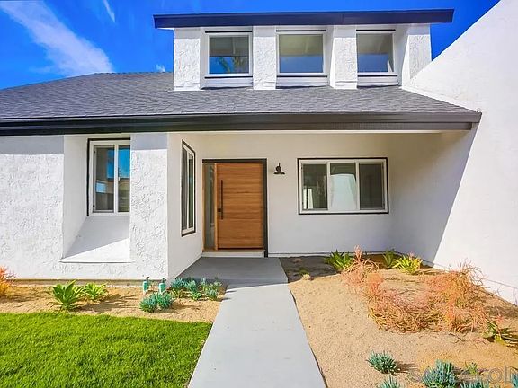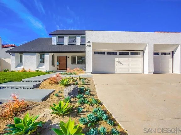Welcome home to this beautiful single level modern 3 bed 2 bath home in La Costa heights with views! This home features expansive vaulted ceilings in the dining, living, and primary bedrooms, a large chef's kitchen complete with modern white oak cabinets and quartz counters, designer finishes throughout, kitchen island with bar seating and custom wood treatment, and cozy fireplace. The primary suite is jaw dropping with large bathroom complete with dual rain shower heads, soaking tub, and a walk in closet you could live in! Additional features include, a separate laundry room, enormous unfinished attic with room for an addition or 350 sf of storage, all new landscaping, a 3 car garage, and private backyard with peak views of the lagoon and ocean! Don't miss this one!
