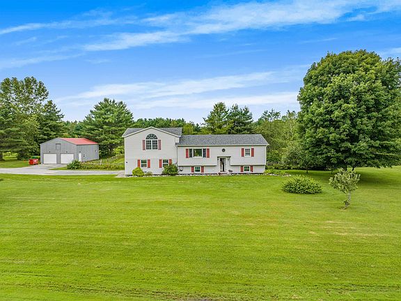 Welcome to an extraordinary property offering a perfect blend of comfort, elegance, and natural beauty. Situated on over 10 sprawling acres, this stunning home boasts 4 bedrooms, 2 bathrooms, and an array of exceptional features that will captivate you from the moment you step inside. Completely remodeled kitchen with exquisite quartz countertops, a peninsula island and white cabinetry creating a sleek and modern aesthetic. Flowing seamlessly into the dining room and light-filled living room. The kitchen & living room both grant access to the two-tier deck, perfect for entertaining while enjoying the stunning views of the fenced-in yard. The main level features 2 spacious bedrooms and a full bath. Downstairs, discover two additional bedrooms, 2nd bathroom and a generous family room with ample space for a home office, with access to the attached 2-car garage. The property also offers a detached garage/2 stall horse barn, catering to both car enthusiasts and equestrian lovers. Prepare to be enchanted by the natural wonders outside, including your own personal waterfall— mature landscaping, orchard, tappable maple trees - a serene oasis where you can enjoy the surrounding wildlife. Complete with solar panels for energy efficiency, new furnace, and whole house generator hookup, this exceptional residence ensures convenience and reduced utility costs. Conveniently located less than 5 minutes from I-89, seize the opportunity to make this remarkable property your own.