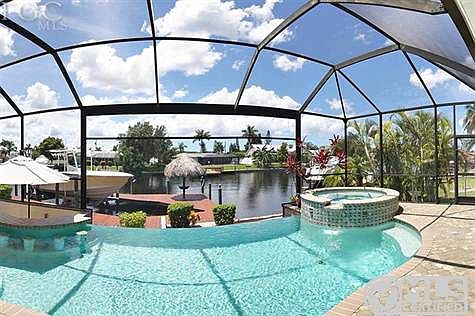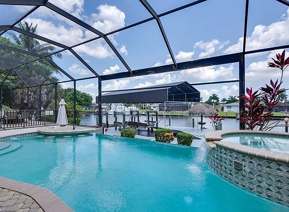 Absolute Boater's Dream Home! This extra wide deep-water canal has Direct Gulf & Sailboat access that's only seconds to the Caloosahatchee River & Gulf. The spacious wooden dock features a Captain's Walk & tiki hut, plus offers water & electric. The 32,000 lb boat lift has a huge canopy & can accommodate up to a 40' yacht. This 4 Bed, 2.5 Bath home offers over 2300 sq ft of living space with a Great Room design accented w/ cathedral ceiling, custom built-in shelving, columns, aquarium picture window, French doors & arched entryways. Oversized lanai featuring an Infinity Edge Saltwater Heated Pool & Spa w/ spill-over waterfall, picture window screen on pool cage, custom poolside bar w/ built-in seats, tiled outdoor shower & Summer Kitchen. The garage is also oversized & can fit a boat trailer that's 23' x 31' or up to 4 cars, paneled walls, modular cabinets, and it is pre-wired for a generator. This home also offers a central vac, built-in pest control system, New A/C 2016, New Refrigerator 2014, surround sound, accent lighting, manablock plumbing, fenced yard, 8' interior doors, arched windows, impact resistant doors & windows, large panel collapsing sliders & plantation shutters.