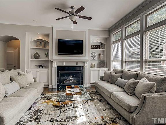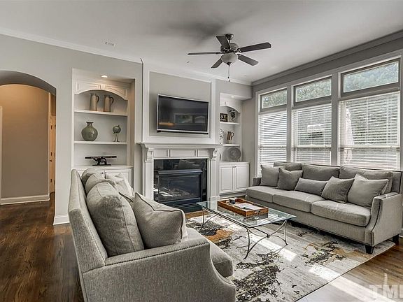 Exquisite 6 bed 5 bath brick home in prime N Raleigh location on .37 acre lot. Fresh paint. New carpet. Hardwoods throughout 1st floor. 10 ft ceilings. Spacious family rm features built-ins & gas log fp. Chef's kitchen offers granite tops, island, s/s appliances (gas cooktop) & tile b-splash. Sunny, vaulted breakfast rm. 1st floor guest suite + office. Large bonus/ loft area. Huge finished basement, with a home theater, office, room, full bathroom, and large family room. Deck + lower level patio w/ great wooded views. Extensive landscaping. Pool community.