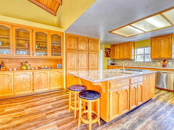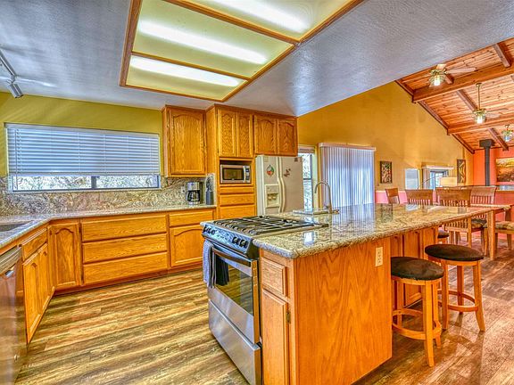 Beautiful and well-maintained home in a great location with golf course views! Turn-key home is being sold completely furnished. Wraparound deck with great views. Enjoy morning coffee from the front deck while soaking in the magnificent view of the sun rising over the peaks of Yosemite. Enjoy an evening glass of wine while relaxing on the back deck and enjoying the wildlife and sunset. Remodeled gourmet kitchen with lots of counter and cabinet space, vinyl plank flooring, granite counters, stainless dishwasher and gas stove/electric oven, and new stainless sink and faucet; refrigerator stays! Large island counter with breakfast bar and sink. New faux wood window blinds and vertical blinds. Large adjacent dining area with deck access and nice yard views. Entry hall has hardwood flooring and LED lighting. Spacious living room with dual access to deck, vaulted knotty pine ceiling with ceiling fan/lights, new bamboo flooring, and woodburning stove with tiled surround. Upstairs master features a private balcony deck with great golf course views; vaulted knotty pine ceiling with skylight, and new faux wood vertical blinds. Attached bath with ceramic tile floors, linen closet and cabinet, extra-large shower with dual shower heads, new fixtures, mirrors, toilet, and LED lights. Main level features a bright front bedroom and a large rear bedroom with access to private deck area. Bedrooms feature recently upgraded carpeting, ceiling fan/lights, and new faux wood blinds. Large remodeled hall bath with vinyl plank flooring, new toilet, shower faucets, and fixtures. Inside laundry with front loading washer and dryer and vinyl flooring Bamboo steps lead down to the 4th bedroom/bonus room with waterproof vinyl plank flooring including closet, hall, and bath. Remodeled half bathroom with new toilet, granite sink and cabinet. Energy efficient home with dual pane windows, evaporative cooler, and Central HVAC which was replaced in 2018, new LED ceiling lights in bedroom closets. Oversized 2 car garage with auto opener, workbench, and storage shelves. Lots of extra parking on extended driveway and room for RV/boat parking area under deck on left side of home (featuring new pavers). Vinyl shed containing firewood at left of home. Landscaping includes 2 Chinese Pistache trees, 2 evergreens, and rear deck entrance gate. Enjoy all of the amenities of Pine Mountain Lake including the Grill and Bar, Championship 18-hole Golf Course and Pro Shop, Equestrian Center, PML Airport, community pool, campgrounds, 202-acre lake with three beaches and "Fisherman's Cove", and Marina Lakeside Café. Sports Courts include tennis, pickleball, bocce ball, volleyball, and horseshoes; and there are archery and gun ranges and numerous hiking and biking trails. Historic downtown Groveland offers lots of dining and shopping opportunities, and Yosemite Park is just 23 miles away.