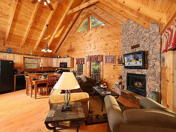 Luxuriously furnished 1 BR, 1.5 Bath log cabin in Prestigious Bear Creek Crossing, a gated community boasting a 65' waterfall, indoor/outdoor pools, miniature golf course and a play area for children. The master bedroom has a huge king-sized bed with a private Jacuzzi and fireplace as well as it s own private bath. There is a sleeper sofa in the loft area. Back porch has a hot tub, swing, two rocking chairs, and a gas grill. Cabin is located just a few minutes from all the shopping, tourist attractions and dining
